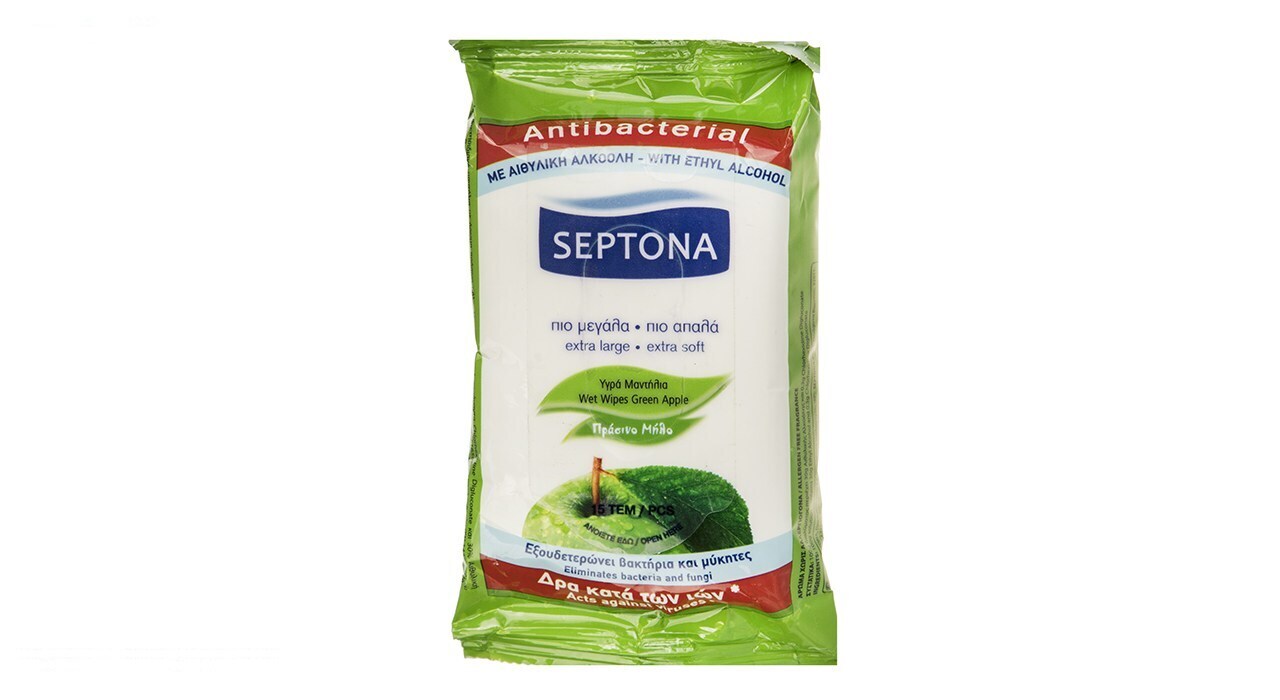 دستمال مرطوب آنتی باکتریال سپتونا (Septona) راهحلی مناسب برای تمیزی و ضدعفونی کردن پوست در مواقعی که دسترسی به آب وجود ندارد. این دستمال مرطوب با عصارهی سیب سبز، رایحهای ملایم دارد و حاوی 15 عدد دستمال بزرگ و نرم است. درب بستهبندی با برچسب برای جلوگیری از خشک شدن دستمالها طراحی شده است. دستمالها حاوی الکل هستند اما سازگاری آنها با انواع پوست تایید شده است. این محصول ساخت بلغارستان تحت نظر شرکت یونانی سپتونا با بیش از 40 سال تجربه در تولید محصولات بهداشتی است.
